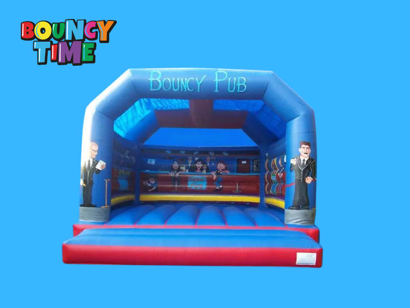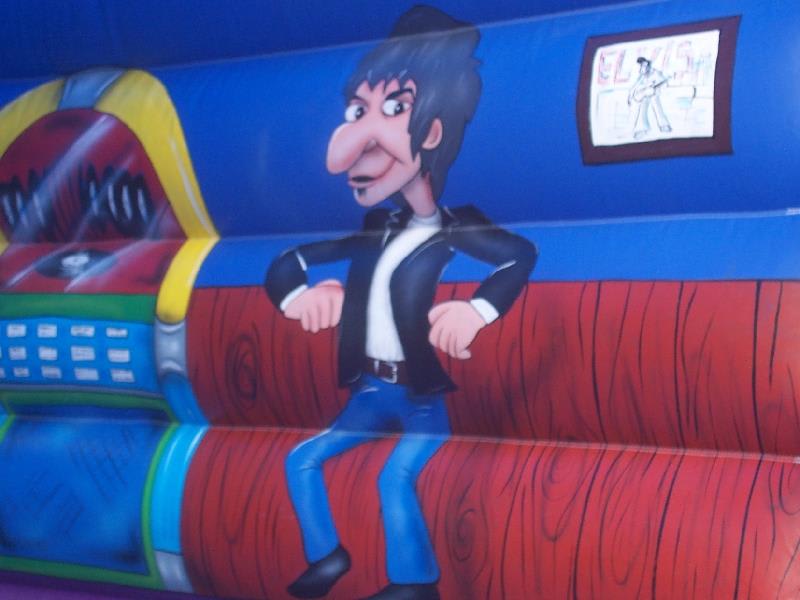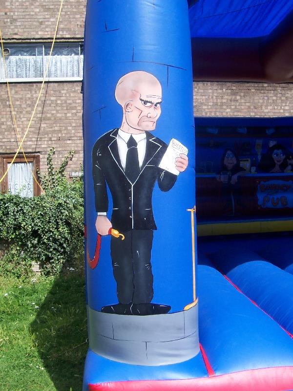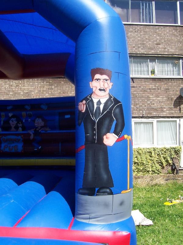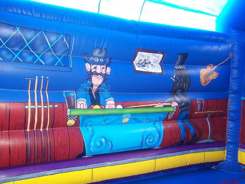 This impressive large Bouncy Castle with a Pub Theme with its favourite rock stars is a ideal way to entertain the whole family, and will add great fun to any occasion trying to bounce with rock stars.also has a fitted mesh to the rear window to stop any climbing on the back wall. the castle comes with 2 inflation fans, extension cable, anchor stakes or sand bags, safety mats and fitted shower cover.