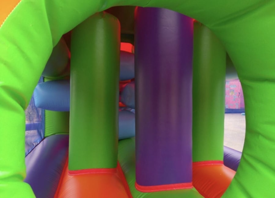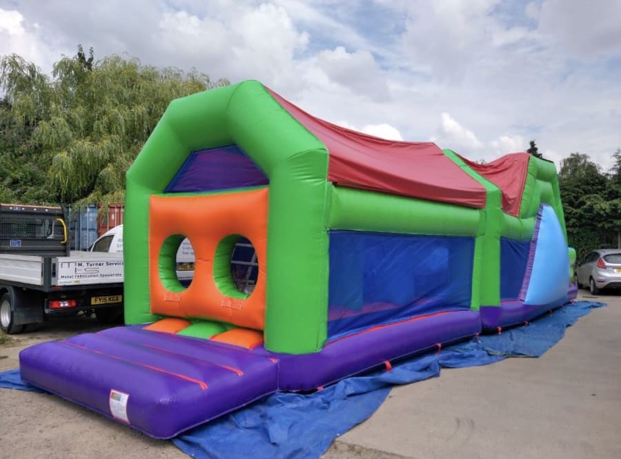 This unit comes in two parts and requires a clear access into the venue and will fit through a standard doorway. Please remember when working out your own measurements for the unit to fit into the venue to allow an extra 6ft to one side for 2 tubes and blowers, and 3ft to the other side to allow the kids to run back to the start again, and 4ft for safety mats to the back and front