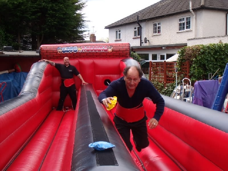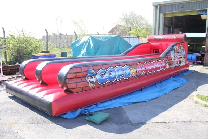 A fantastic 35ft long cops and robbers theme bungee run, great fun for all the family, and ideal for school fetes, fun days, suitable for both adult and children, we recommend a minimum age of 7 years and over, competitors simply fit the belts round their waist and run like crazy to put the disc as far down the lane onto the velcro strip to mark their distance. comes with 2 sets of belts for both kids and adults. also comes with inflation fan, extension cable, anchor stakes or sand bags