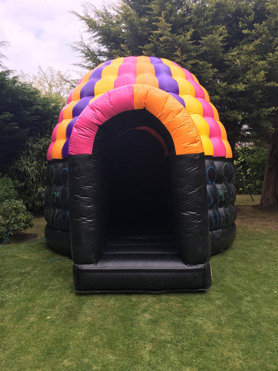 A fantastic inflatable that has music playing and disco lights flashing that will make any party a big hit. You have got to see it to believe it. Once inside the Dome you would think you are at some night club. Suitable for all ages. Comes with inflation fan, extension lead, sand bags or stakes, safety mat, and of course the large speaker which can be connected to any blue tooth device (please note we have had some customers experiencing issues with the use of the Spotify app when connected to the speaker, we recommend using YouTube or Apple Music apps), and disco lights. also comes with inflation fan, extension cable, anchor stakes or sand bags, safety mat, and fitted shower cover.