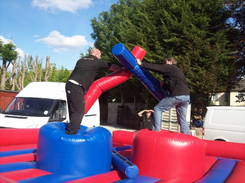 A fantastic gladiator duel. Yes you need strength and a lot of stamina, can you knock your opponent off the podium. Gladiators combat on a 20ft x 20ft inflatable bed for extra safety in mind. Comes with junior head safety protectors and two long padded foam batons, suitable for kids from 7 years of age, great fun the gladiators and the audience. Ideal for school fetes, fun days etc. The inflatable flat bed comes with 2 x 2.O.Hp inflation fans, extension cables, anchor stakes, or sand bags.