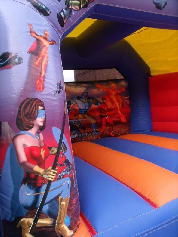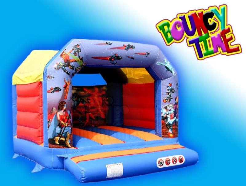 Another very popular bouncy castle with its action heroes boys theme and digital artwork, suitable for kids up to the age of 12 years, and will hold 6 to 8 children at any one time depending on age and height. this castle comes with inflation fan, extension cable, anchor stakes or sand bags, safety mat and fitted shower cover.