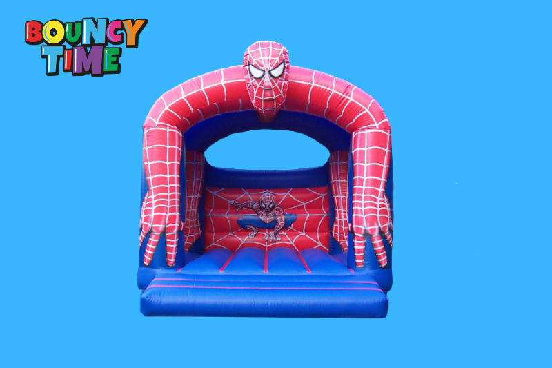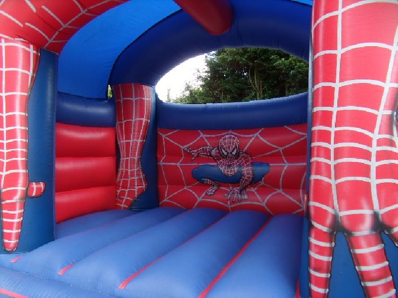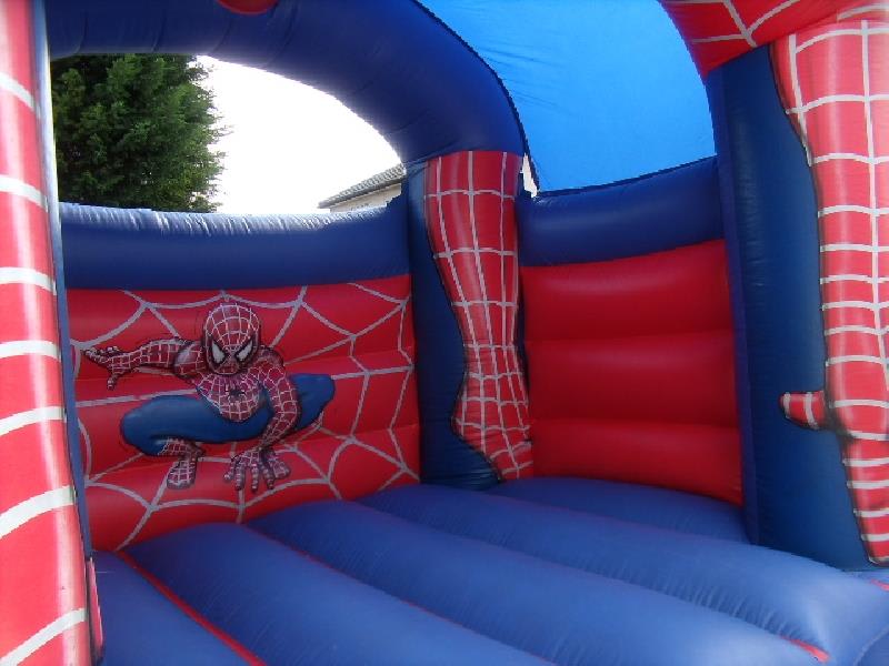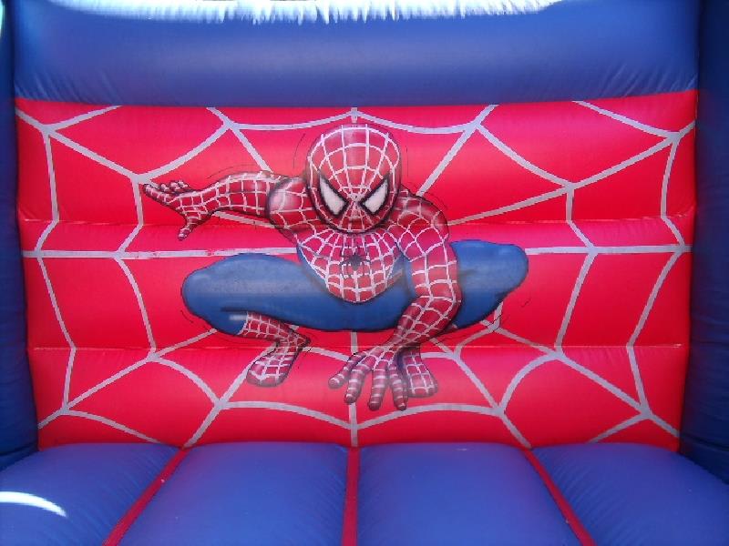 A spider man theme bouncy castle for the boys. with its great visualisation, they will just love it, also has 6ft walls and is suitable for kids up to 12 years of age, and will hold 6 to 8 children at any one time depending on age and height. also has a fitted net to the rear window to stop any climbing over the wall. this castle comes with inflation fan, extension cable, anchor stakes or sand bags, safety mat and fitted shower cover.