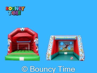 This package contains a football shoot out as well as a a football theme bouncy castle, 2x inflation fan, extension cables, anchor stakes or sand bags and 2 footballs.